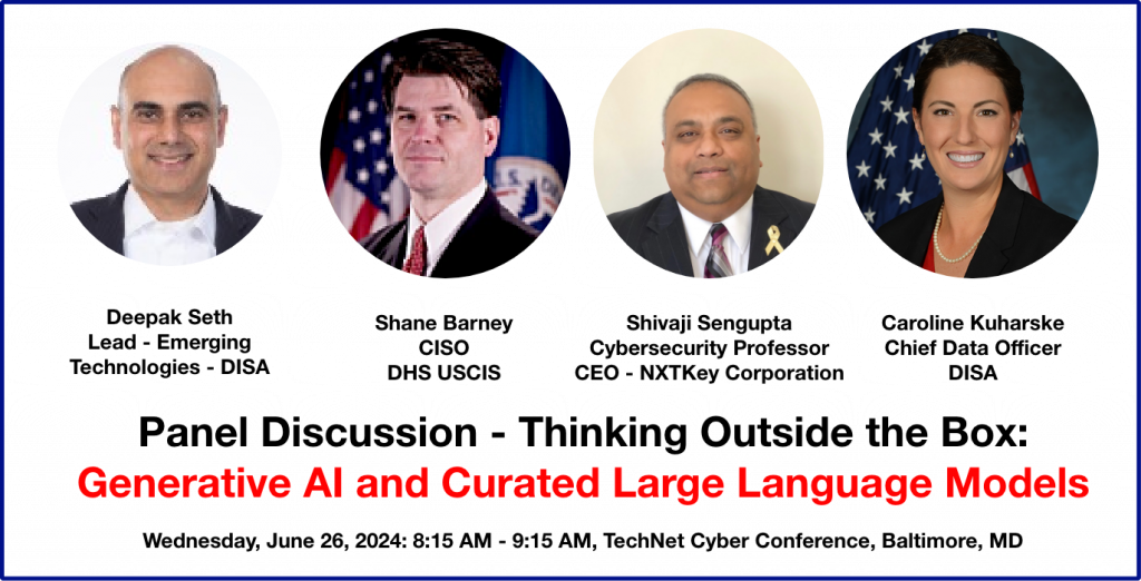 June 25th 2024. Baltimore, MD – Shivaji Sengupta is hosting a panel (8.15 AM EST Room: Engagement Theater 1: Swing Hall – #3203) at the AFCEA TechNetCyber 2024 Conference with key individuals from Defense Information Systems Agency (DISA) and Department of Homeland Security (DHS) discussing a topic of utmost importance in today’s rapidly evolving world of technology and security. The subject at hand is “Generative AI and curated Large Language Models (LLM)” would explore several key topics, including the development, applications, ethical considerations, and future directions of these technologies.